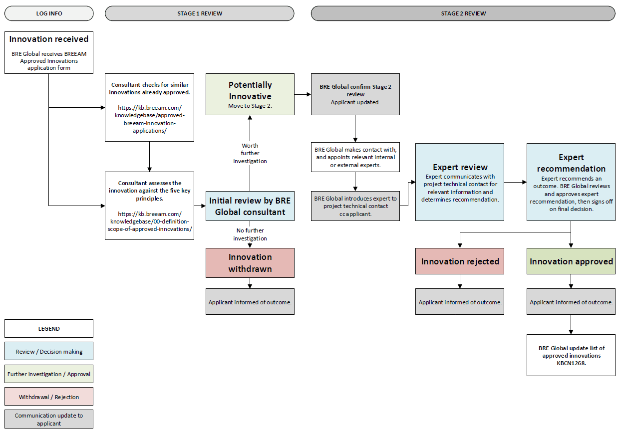 • Progress to Stage 2: the application is potentially innovative, and further review by a relevant expert is required. A combined fee for ‘initial review’ AND ‘peer review and decision’ is charged, which enables BRE Global to appoint a relevant specialist for the Stage 2 review.