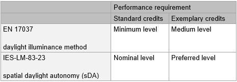 To use either the EN 17037 or IES-LM-83-23 option, the methodology within Guidance Note 50 must be followed. In addition, the minimum percentage area to comply, dependant on the building type and space type, must be met in accordance with the criteria within the relevant BREEAM issue. To calculate the percentage of assessed area that complies, follow KBCN0471 or KBCN1081.